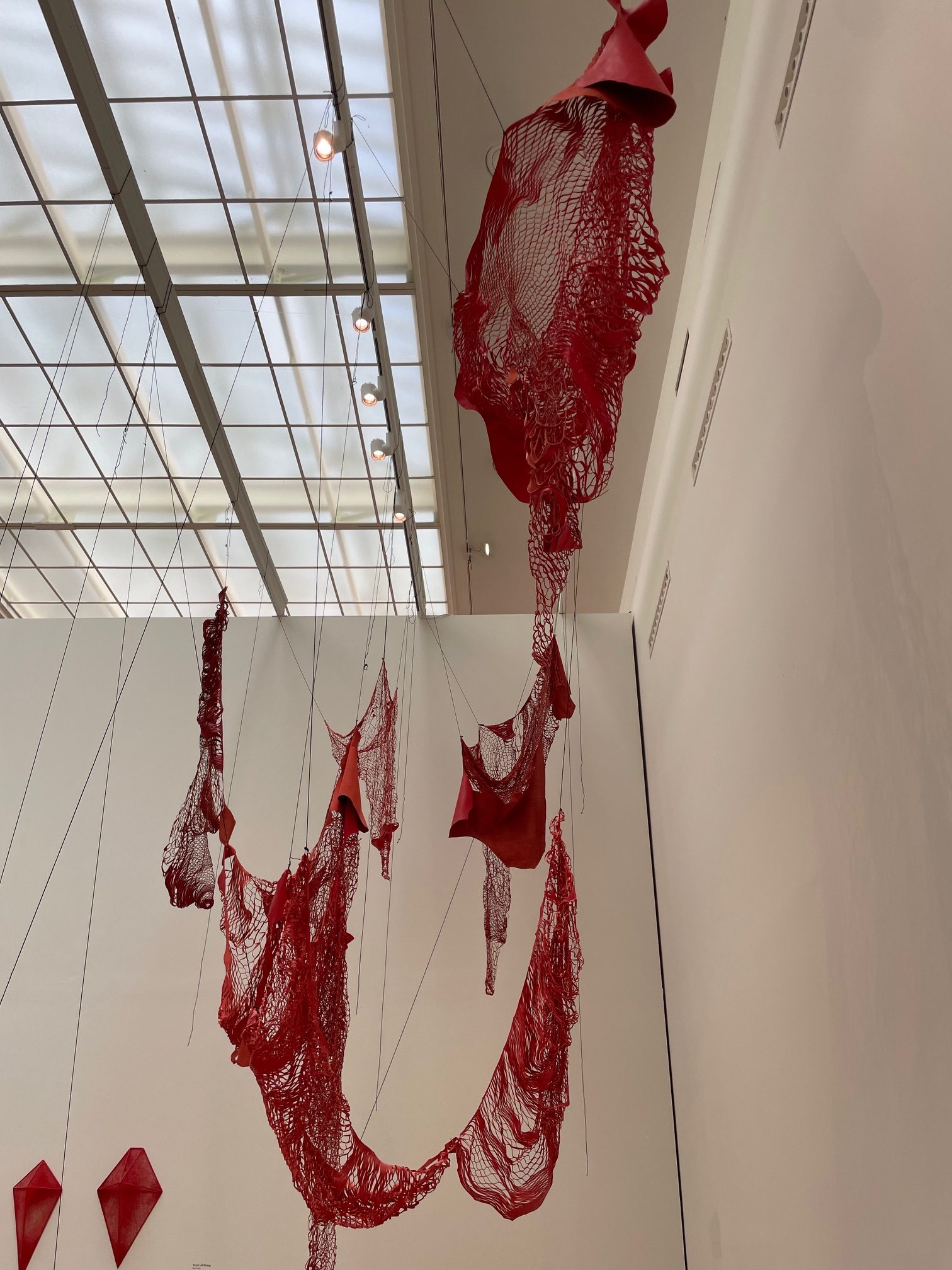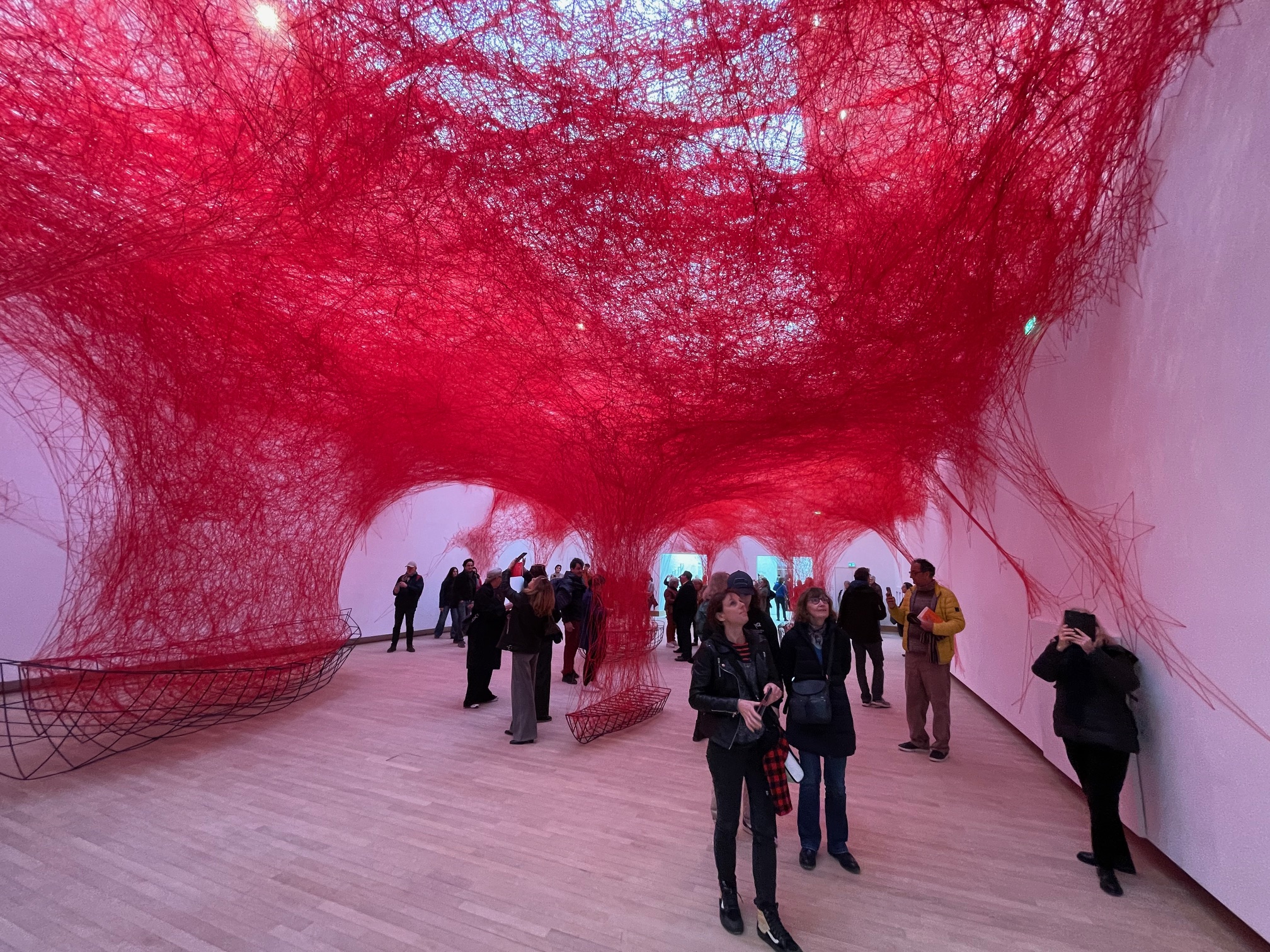 En franchissant la porte, je lâchais un « Wouah » d’émerveillement. Devant et au-dessus de nous, une vaste pièce entièrement revêtue de centaines de kilomètres de fils rouge, entrelacés on ne sait comment pour créer un immense cocon. Au sol, des barques arrimées pour lester ces fils: qui retient quoi? la barque le fil? le fil la barque? Selon l’artiste « les fils s’emmêlent, s’entrelacent, se cassent, se défont. D’une certaine façon ils symbolisent mon état mental vis-à-vis de la complexité des relations humaines ».