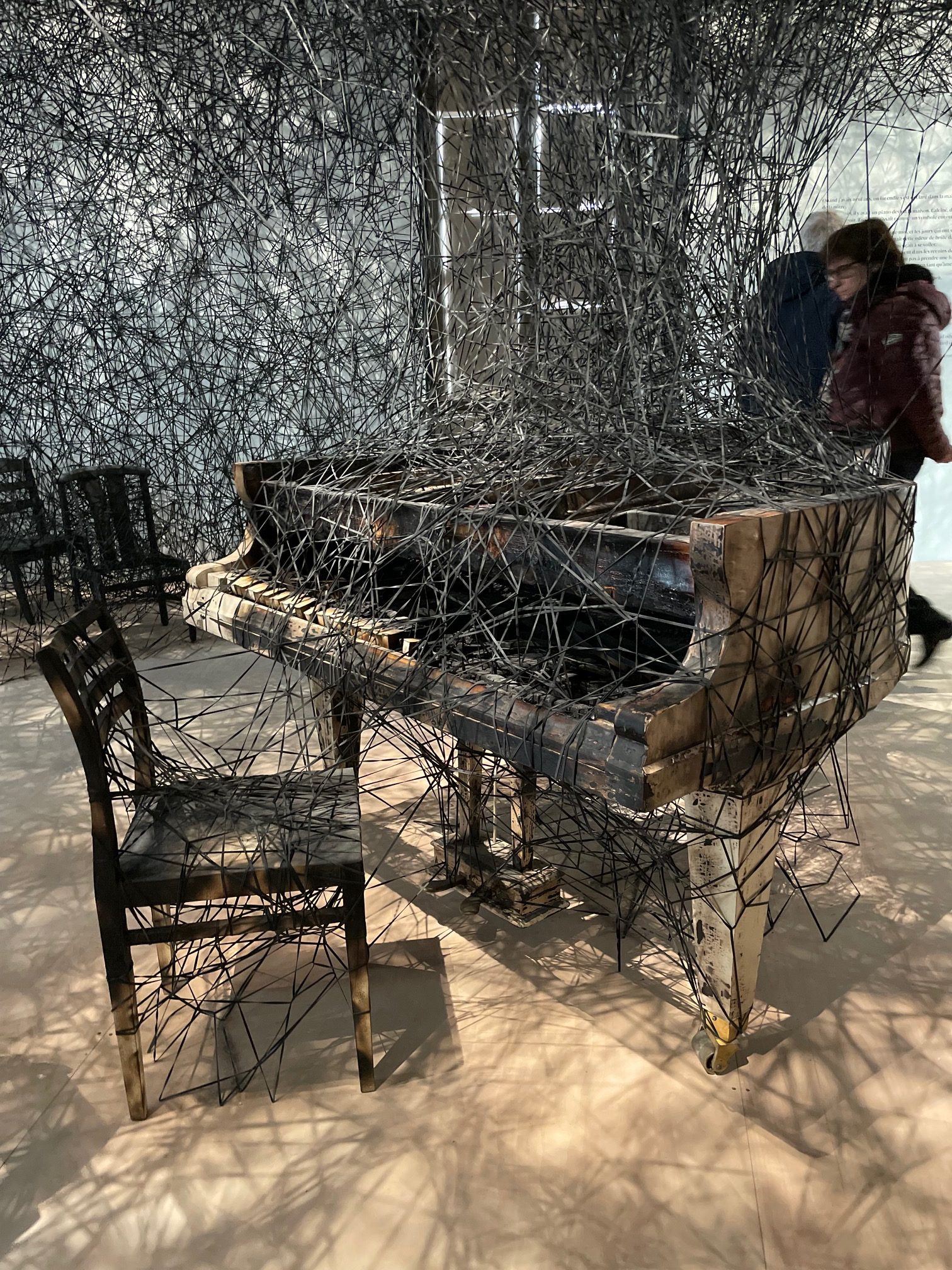 Dans la pièce suivante, un autre vaste enchevêtrement de fils, noirs cette fois, nous attend, créant la surprise. Au sol, des chaises et un piano calcinés capturés par les fils. L’ambiance, plus sombre, n’en est pas moins élégante et fascinante.