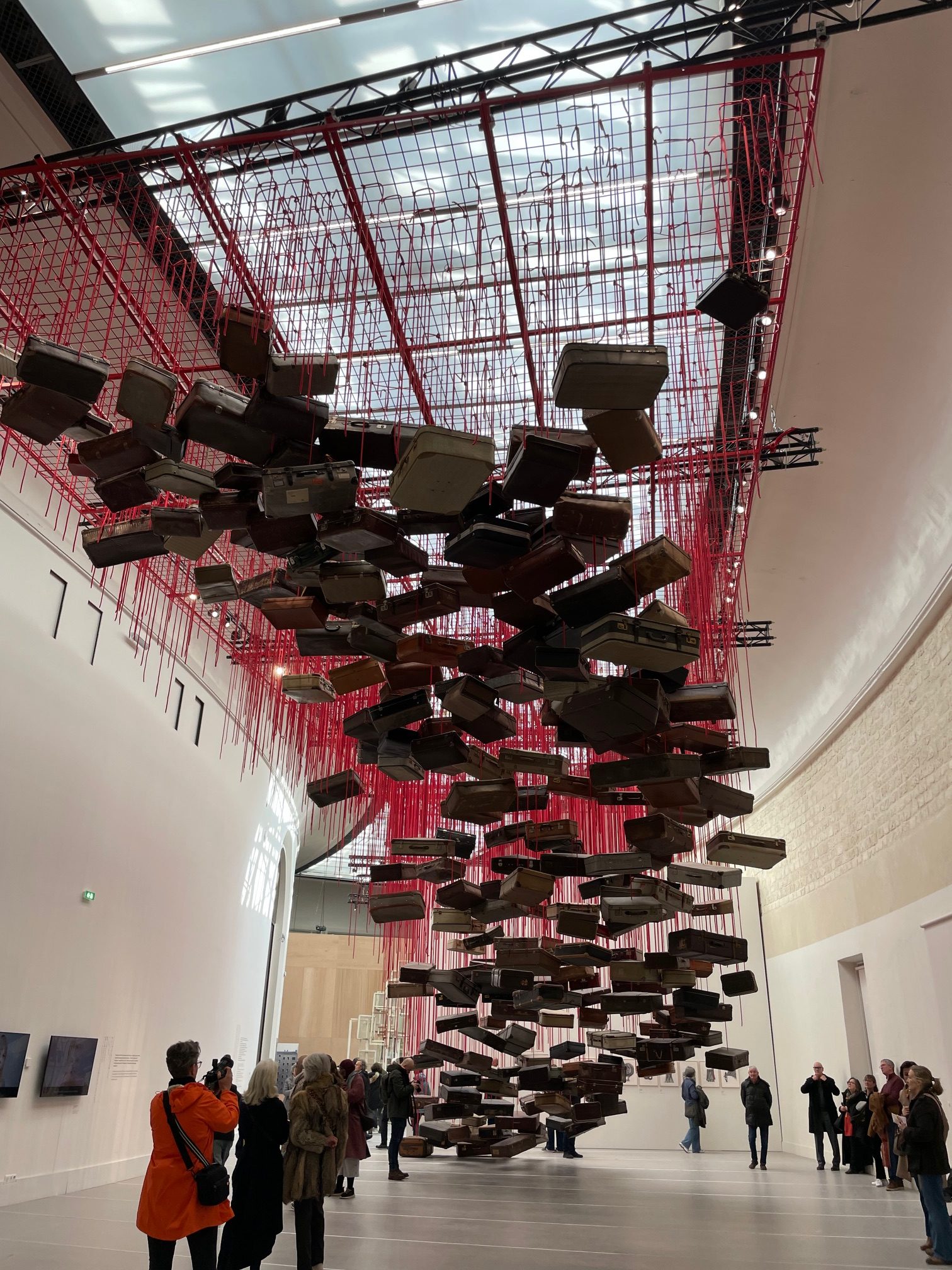 Au cœur de l’exposition, une installation non moins impressionnante prend forme : des valises suspendues à des fils rouges semblent flotter dans l’espace. Évoquant l’exil et le voyage, elles font ressurgir des souvenirs et parlent de départs, parfois pour toujours.